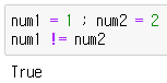 - 값이 같지 않으면 True, 값이 같으면 False 반환