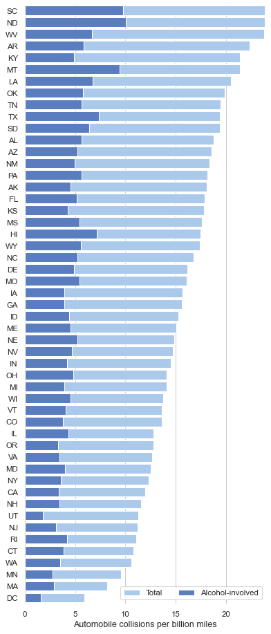 crashes = sns.load_dataset("car_crashes").sort_values("total", ascending=False)