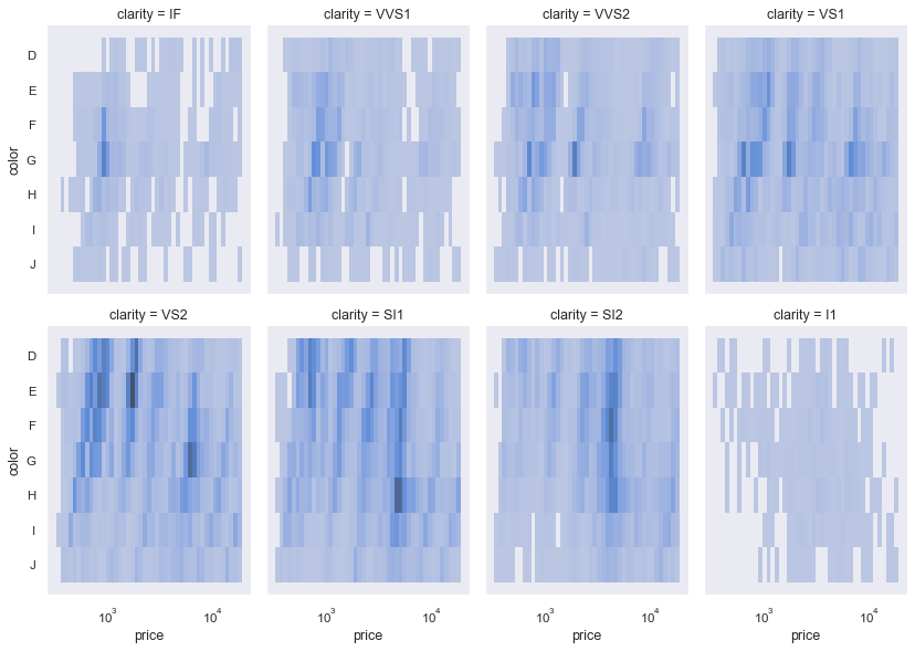 data=diamonds, x="price", y="color", col="clarity",
