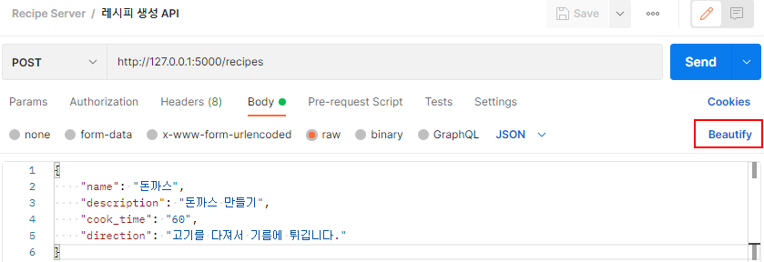 - Body - raw - JSON - 코드 입력 - Send