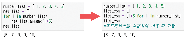 - 리스트 컴프리헨션 사용 예시 - 새로운 리스트에 기존의 값들을 +5하여 저장
