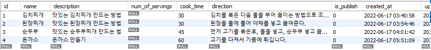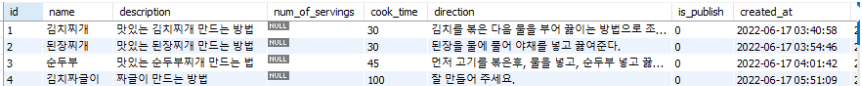 - 수정 후 : update recipe set name=%s, description=%s, cook_time=%s, direction=%s where id = %s