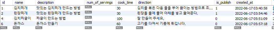 - id = 2의 is_publish 컬럼 변경 확인 : 1 (select * from recipe)