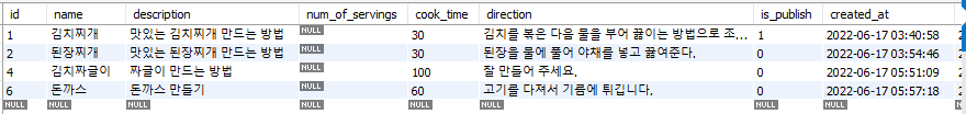 - is_publish = 1 인 값 확인 (select * from recipe)