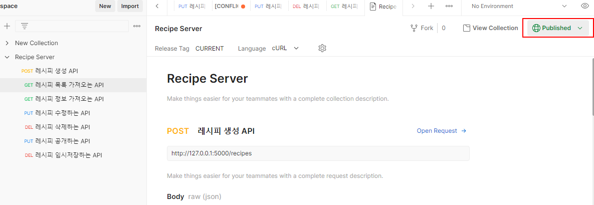 생성되는 url 클릭 (This collection is published at: ~)