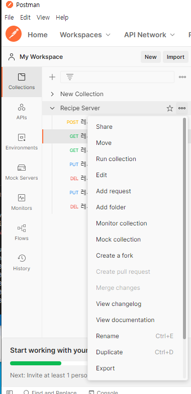 문서화 할 Collection의 메뉴 선택 (…)