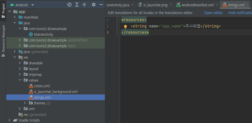 - <string name="app_name"> </string> 사이에 앱 이름 입력