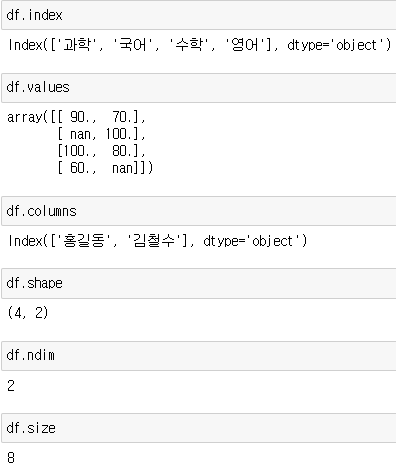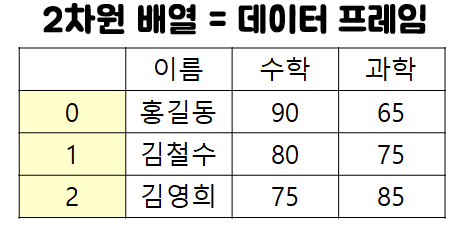 - 데이터프레임(DataFrame)이란? 2차원 형태를 갖는 배열