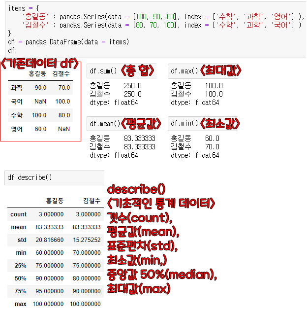 std(표준편차), count(갯수), describe(통계데이터) 등등