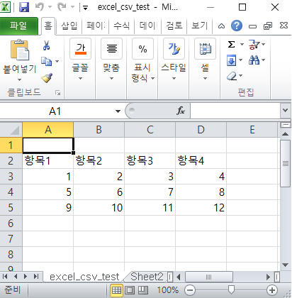 - 메모장으로 생성하였던 파일(csv_test.csv) 불러오기