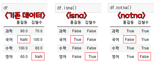 - .notna() : isna의 반대개념. NaN값이 없을 경우 False, 있을 경우 True 값 반환