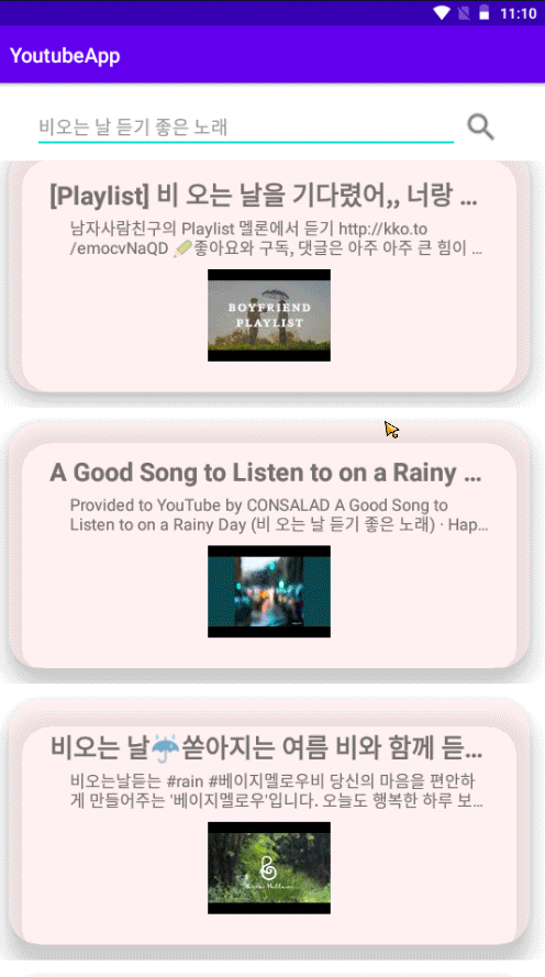 - 유튜브를 검색하고 리사이클러뷰(id:rv)에 검색 결과 표시