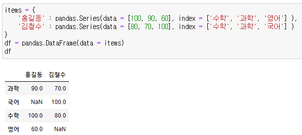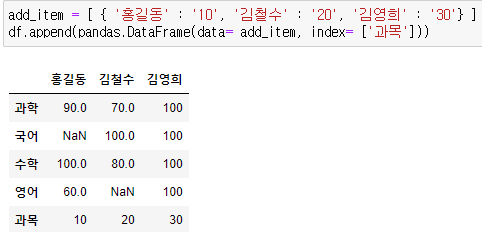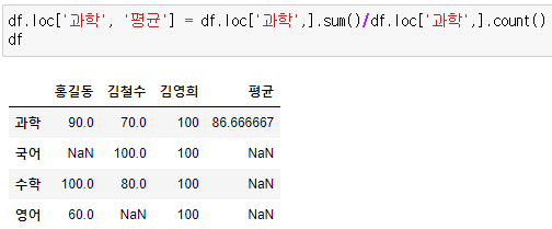 - 인덱스와 컬럼으로 접근하기 : df.loc['인덱스명', '칼럼명']