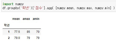 - groupby.agg(함수) : 그룹을 한번에 여러 연산을 수행하고 결과 값을 출력