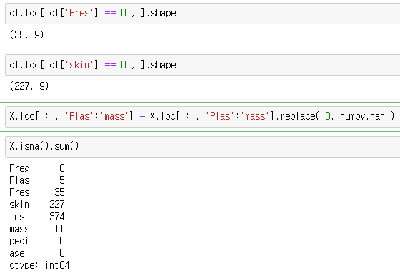 - 예시) 0의 값 존재시 모든 0의 값을 NaN으로 변경