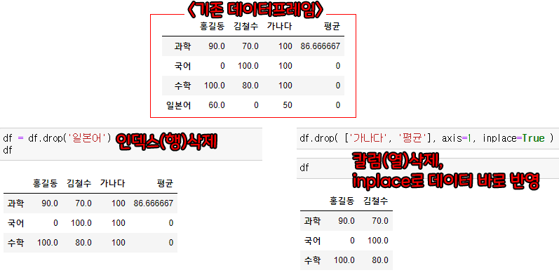 - inplace > 원본 데이터에 바로 반영하는지 유무, True로 하면 해당 데이터프레임에 삭제한 데이터 바로 반영