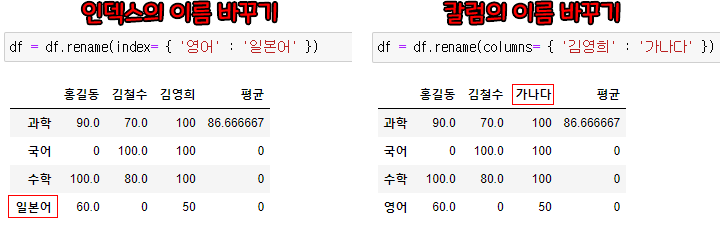 - df.rename(index/columns = { 기존이름 : 바꿀이름 }) : 기존 이름을 바꿀 이름으로 변경