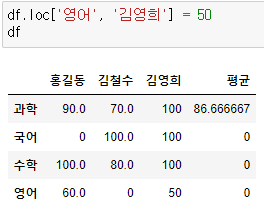 - 바꿀 값의 위치 = 바꿀 값 ( loc, iloc, 칼럼명 셋 다 동일)