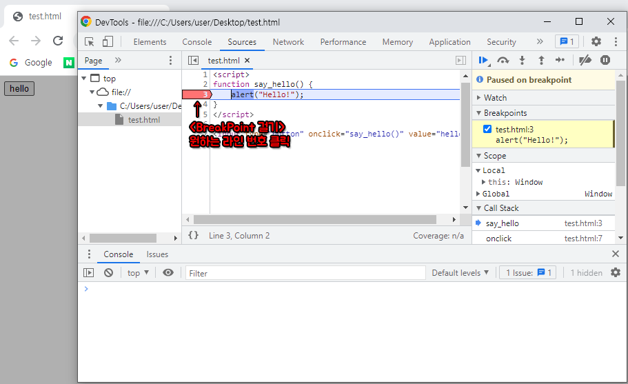 - 예시) 의도적으로 alert 대화상자 출력 명령을 중지점으로 중단하기