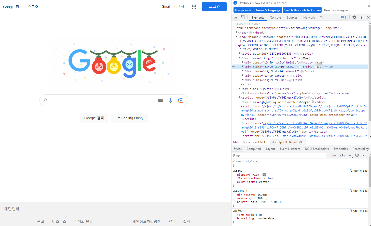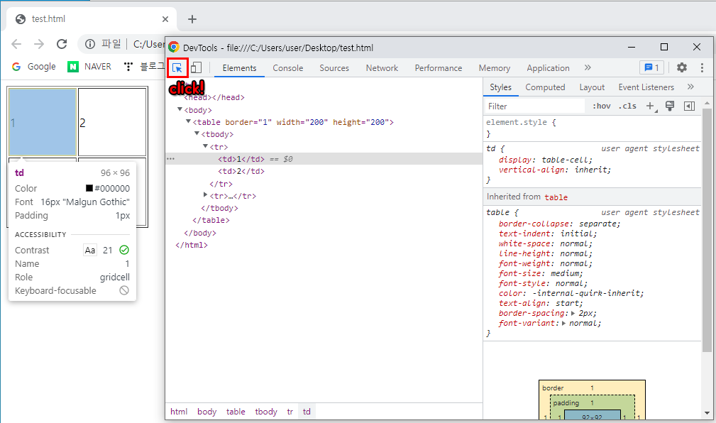 (buttom name : Select an element in the page to inspect it)- 지정된 요소는 정의된 값을 확인 할 수 있음
