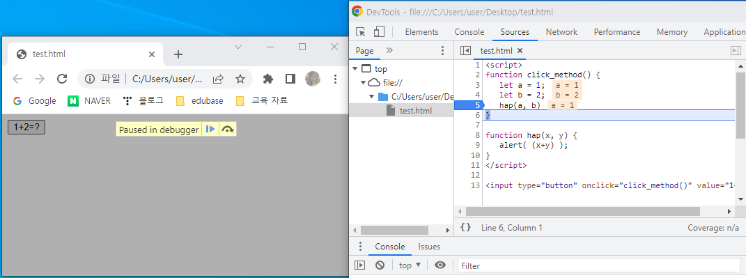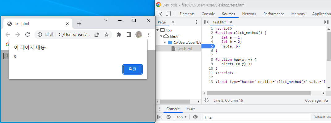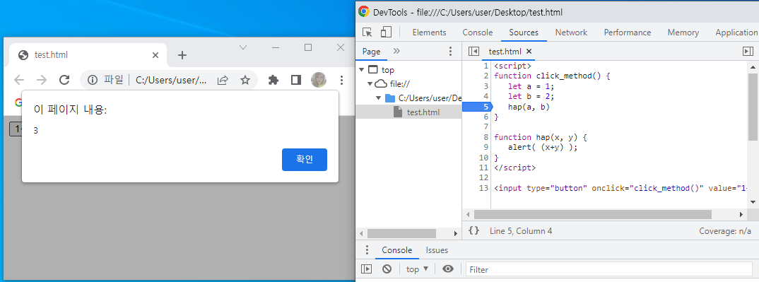 - hap 함수에 매개변수 전달, hap 함수로 이동하여 다음 줄의 코드 실행(alert)
