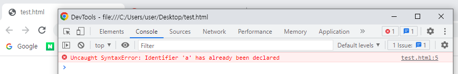 - 예시) 구문 오류(SyntaxError)를 일부러 발생시켜서 오류 확인해보기