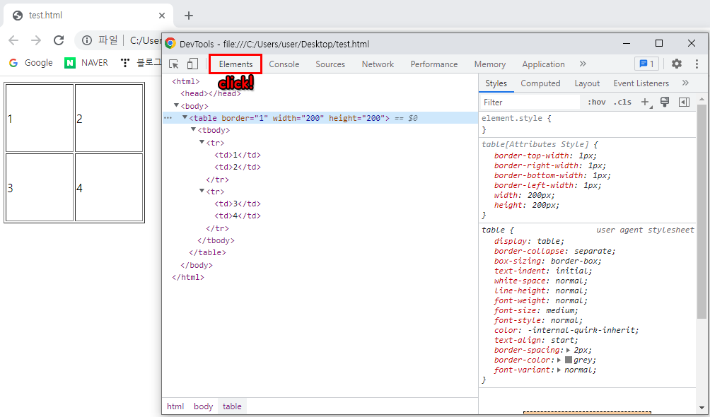 - 메뉴 탭의 'Elements' 클릭하면 해당 페이지의 html 문서를 확인 할 수 있음