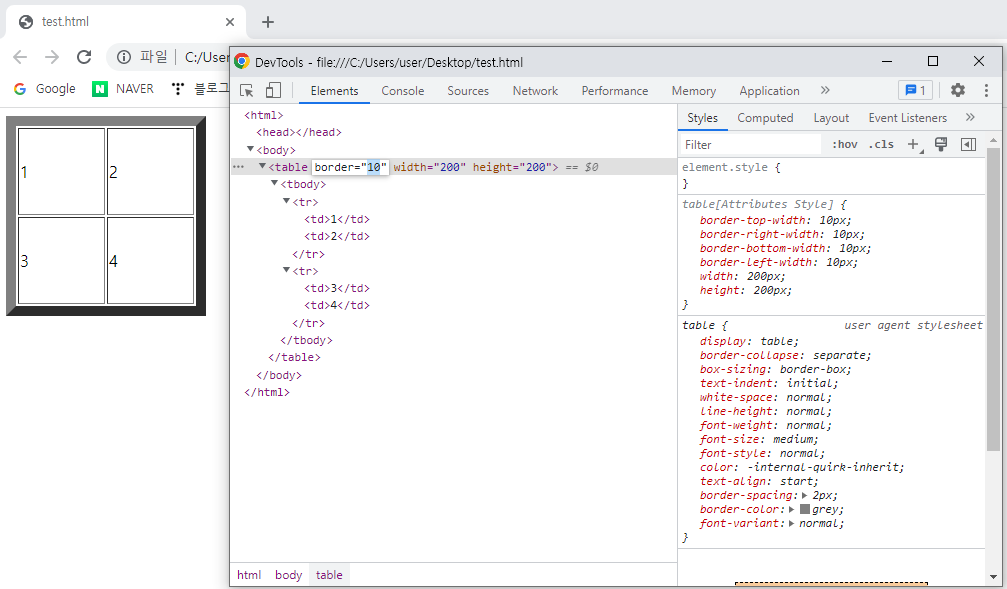 - 예시) 테이블의 테두리를 1에서 10으로 변경