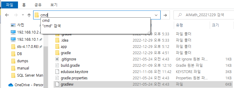 - 파일 확인 후 프로젝트 폴더의 경로에서 cmd 실행 (입력 후 엔터)