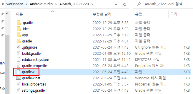 - 해당 프로젝트 폴더로 이동해보면 'gradlew' 파일이 존재한다.