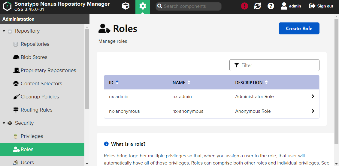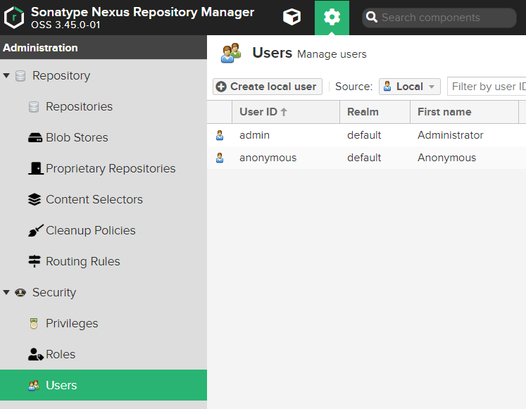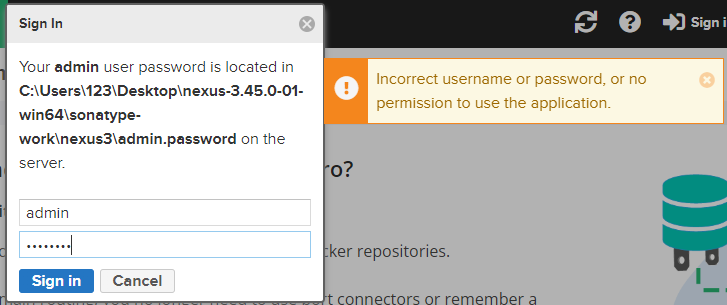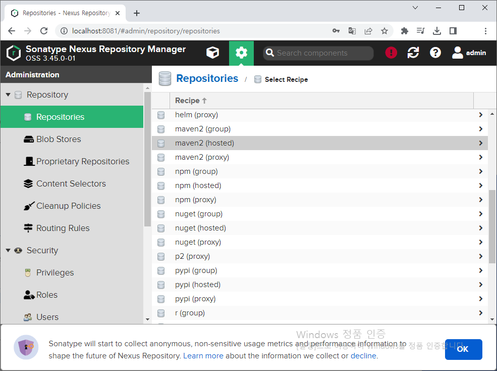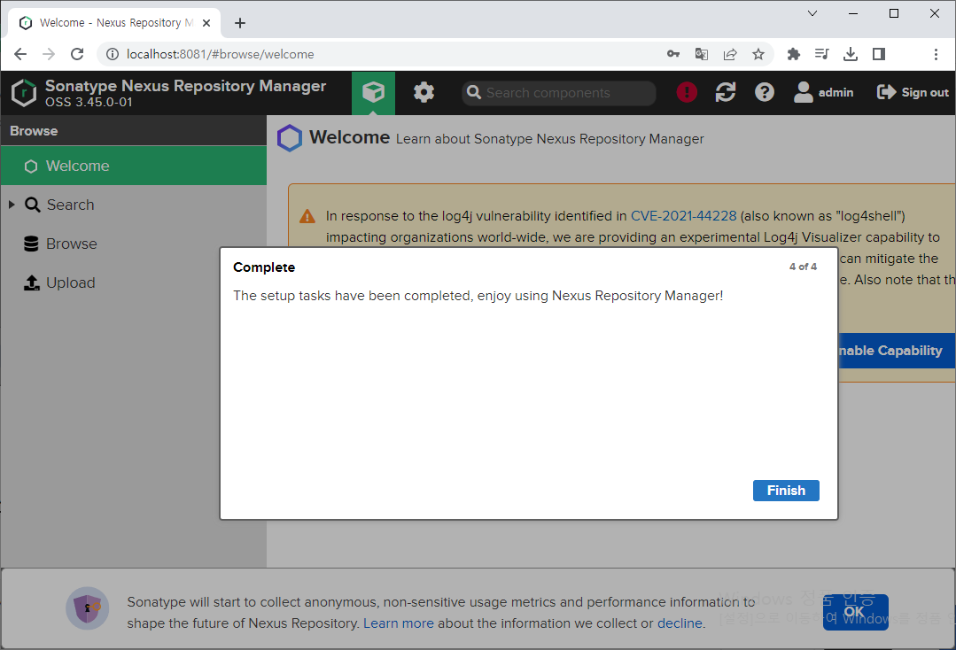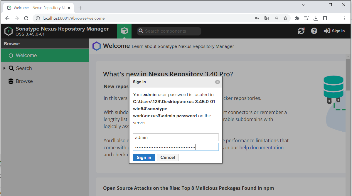 - 넥서스 3.17 이후 버전은 admin123이 아닌 기본 설정 비밀번호가 없는 상태로 설치