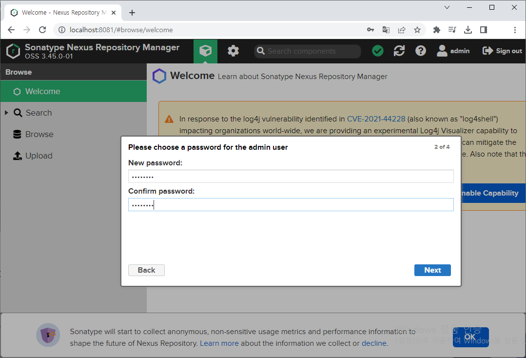 - admin 계정의 새로운 비밀번호 입력 - Next