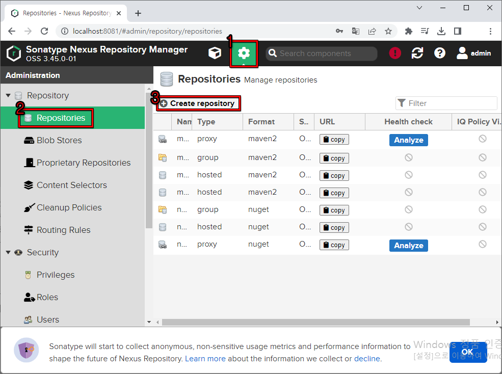 - 2. 좌측의 메뉴에서 Repository - Repositories