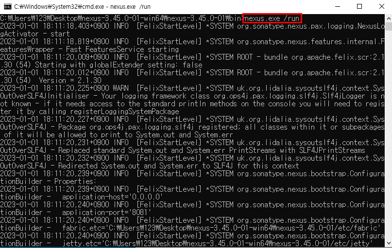 - 아래의 문구가 뜨면 정상적으로 넥서스가 실행된 것