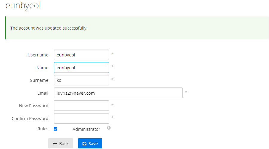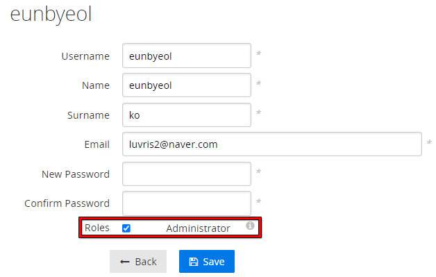 - Roles(Administrator) 체크 - Save