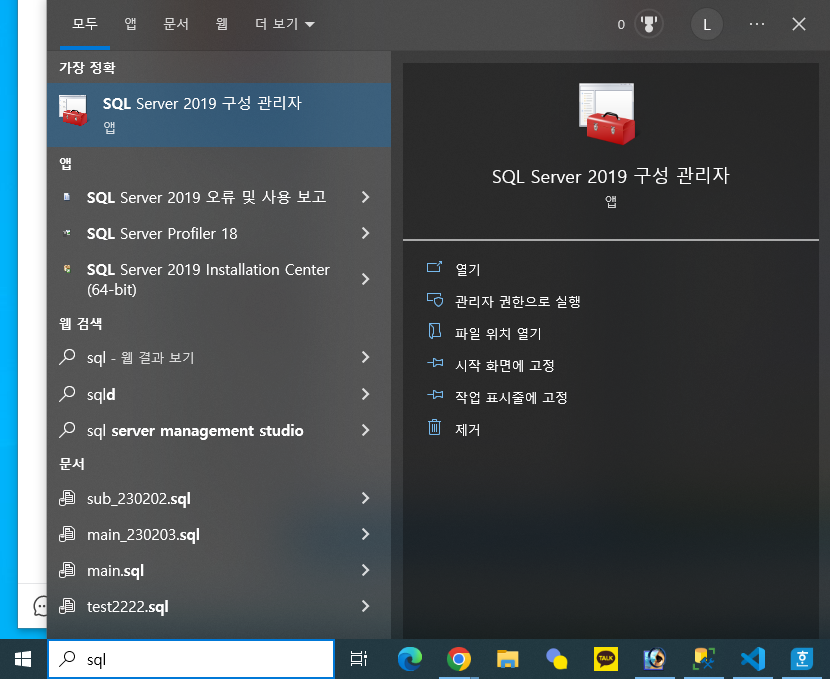 - 윈도우키 - SQL 검색 - SQL Server 구성 관리자 실행