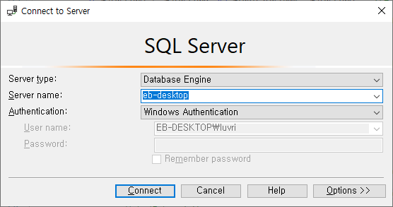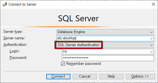 - 인증(Authentication) : SQL Server Authentication 으로 변경