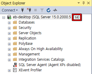 - 관리자 계정(sa)로 연결된 화면