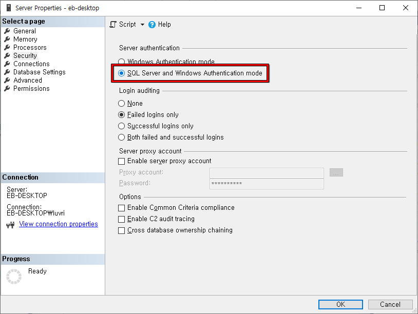 - 보안 - 서버 인증 - SQL Server 및 Windows 인증 모드