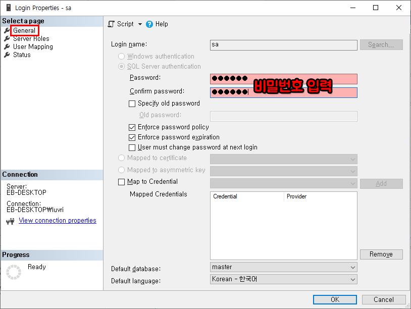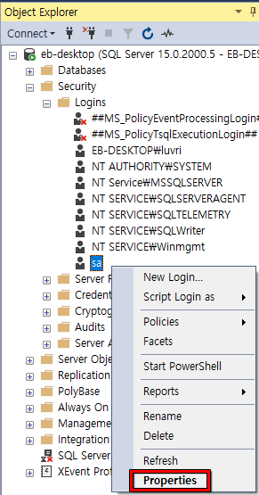- SQL 서버 - 보안 - 로그인 - sa 우클릭 - 속성