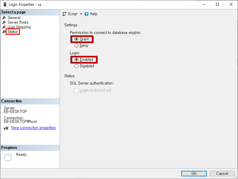 (Status - Permission to connect to database engine (Grant) - Login (Enabled)) - 확인 (OK)