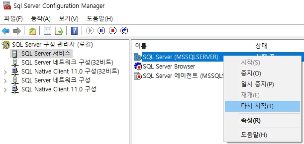 - SQL Server 서비스 - SQL Server 우클릭 - 다시 시작