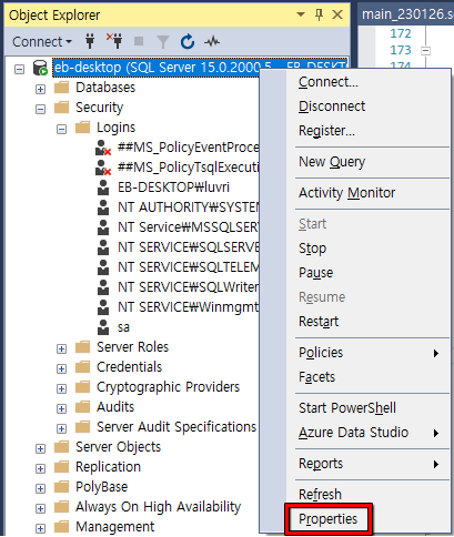 - 객체 탐색기 - SQL 서버 우클릭 - 속성
