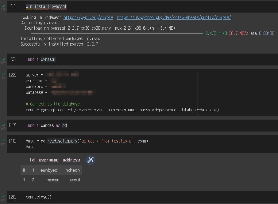- colab에서 pymssql 모듈을 이용하여 DB에 접속, 데이터를 데이터프레임으로 출력