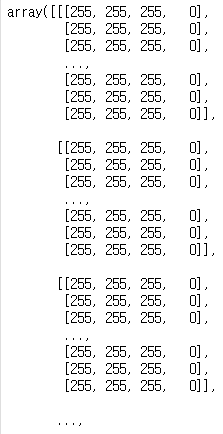 - numpy.array(이미지파일저장변수) : 이미지 파일이 저장되어 있는 변수를 배열로 변환