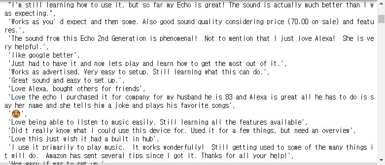 - 리뷰(verified_reviews) 칼럼의 문자열을 하나의 문자열로 변경