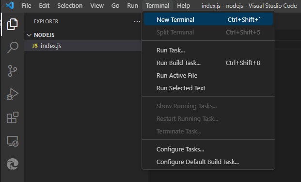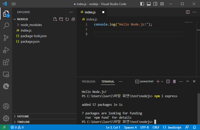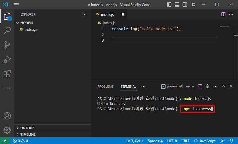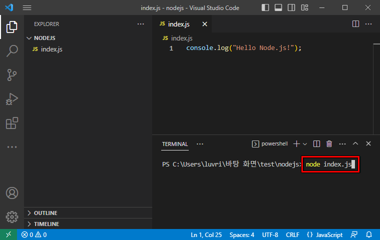 - 터미널에서 해당 파일 실행 (node.index.js)