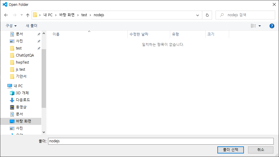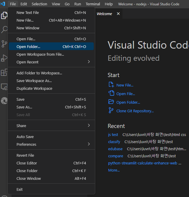- 메뉴의 File - Open Folder - 프로젝트 폴더 선택