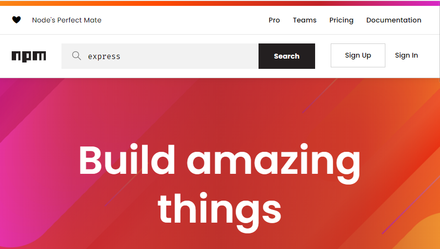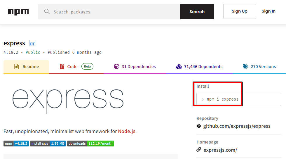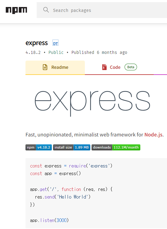 - npm 홈페이지에 접속하여 express 검색