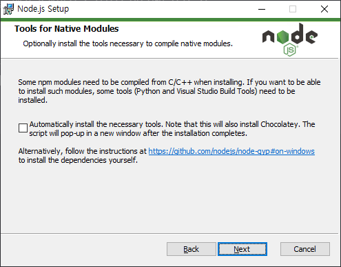 - 모듈이 다른 언어 혹은 도구가 필요할 수 있으므로 필요한 도구를 자동 설치 할 것인지 확인